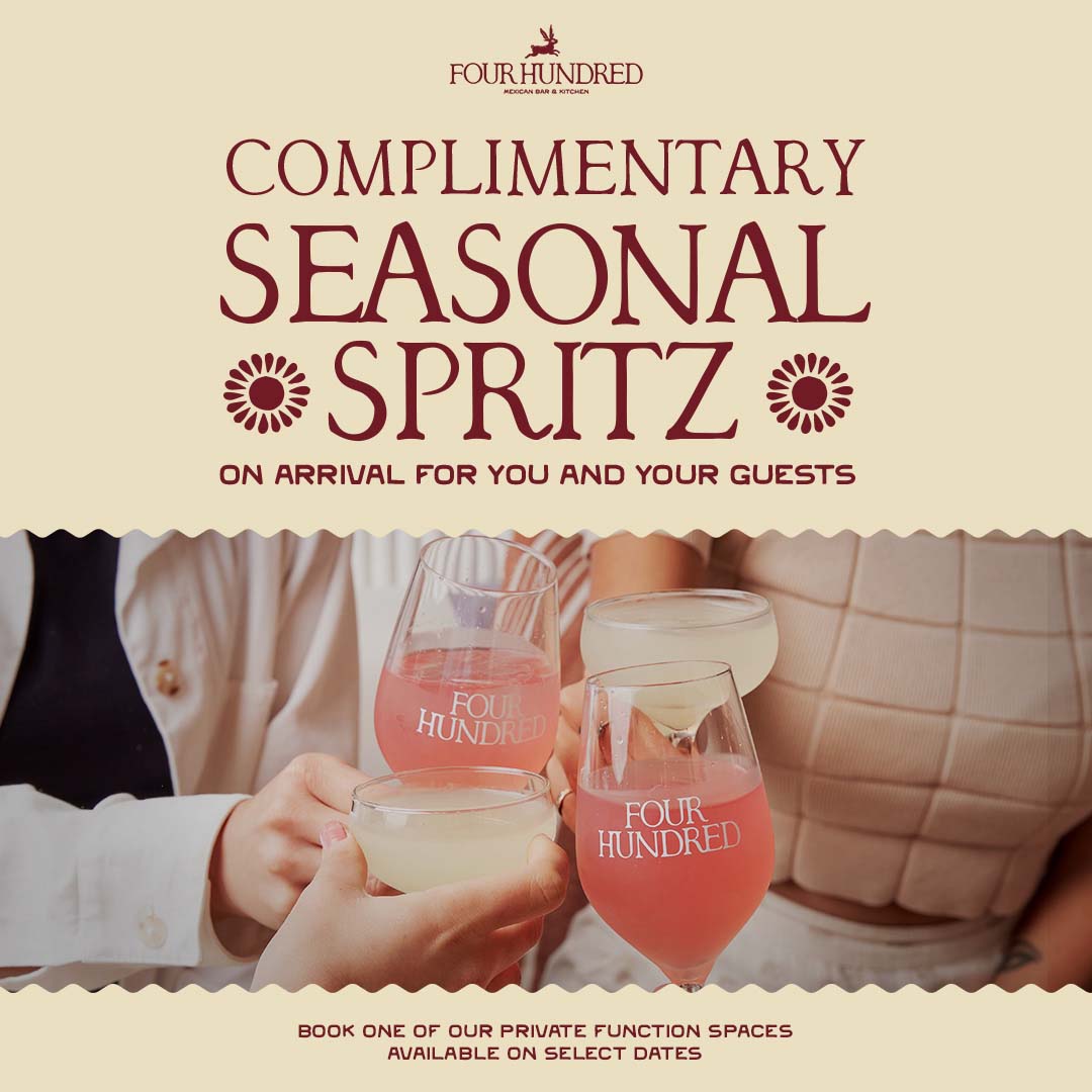 [mkdf_separator class_name="" type="transparent" position="center" color="" border_style="" width="" thickness="" top_margin="12px" bottom_margin=""] Christmas Functions Say "Salud!" this festive season Receive a complimentary seasonal spritz on arrival for you and all your guests [mkdf_separator class_name="" type="transparent" position="center" color="" border_style="" width="" thickness="" top_margin="22px" bottom_margin=""] [mkdf_separator class_name="" type="transparent" position="center" color="" border_style="" width="" thickness="" top_margin="22px" bottom_margin=""] [mkdf_separator...
